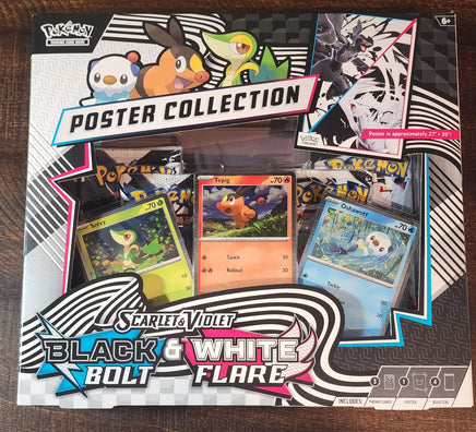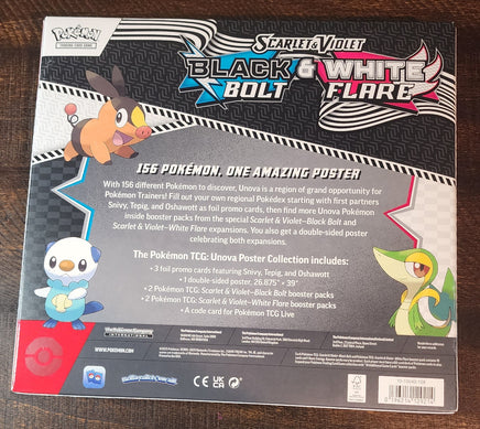 With 156 different Pokémon to discover, Unova is a region of great opportunity for Pokémon trainers! Fill out your own regional Pokedex starting with the first partners Snivy, Tepig, and Oshawott as foil promo cards, then find more Unova Pokémon inside booster packs from the special Scarlet & Violet - Black Bolt and White Flare expansions. You also get a double-sided poster celebrating both expansions.
