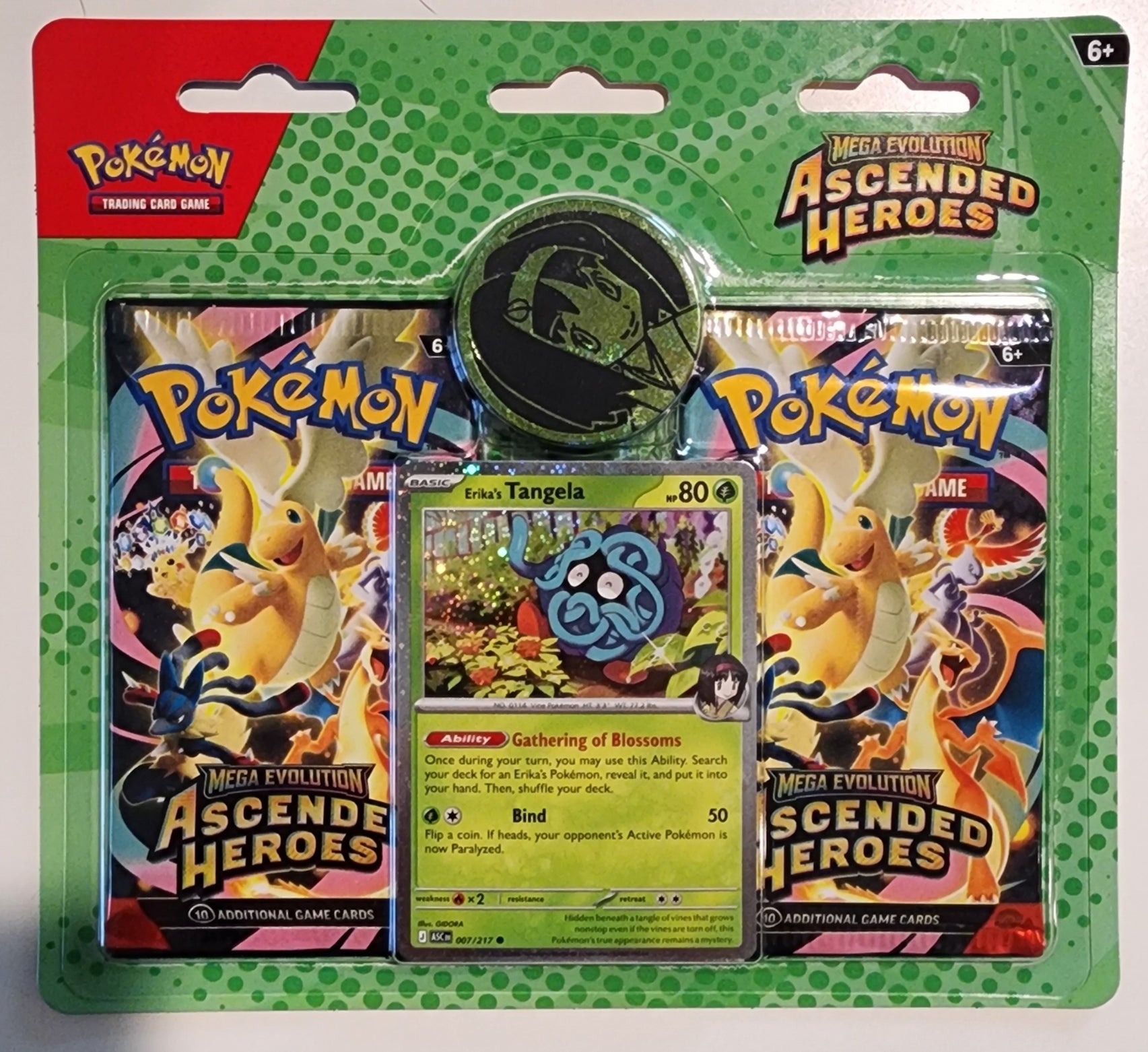 The Celadon City Gym is filled with beautiful greenery and Grass-type Pokémon galore. Among them is Erika's Tangela, a Trainer's Pokémon with the power to gather it friends! In this collection, you'll find Erika's Tangela as a foil promo card, joined by a metallic coin featuring Gym Leader Erika, and two booster packs from the special Mega Evolution Ascended Heroes expansion.